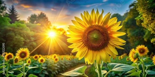 © sanom, Fototapeta premium Sun-Like Sunflower in Park Garden - Vibrant Landscape Photography