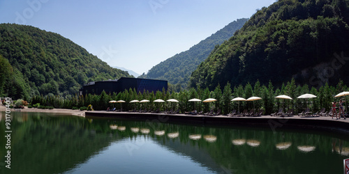 © kirillk, Fototapeta premium sun loungers at the pool with umbrellas