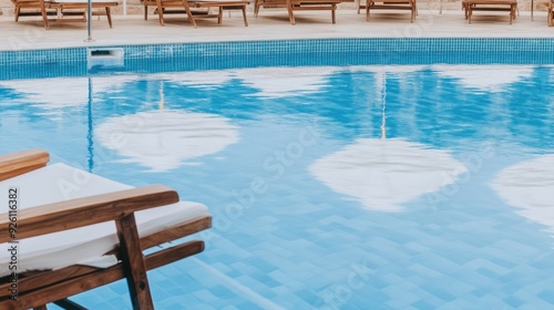 Obraz premium Sun loungers line the edge of a shimmering pool, featuring white umbrellas...