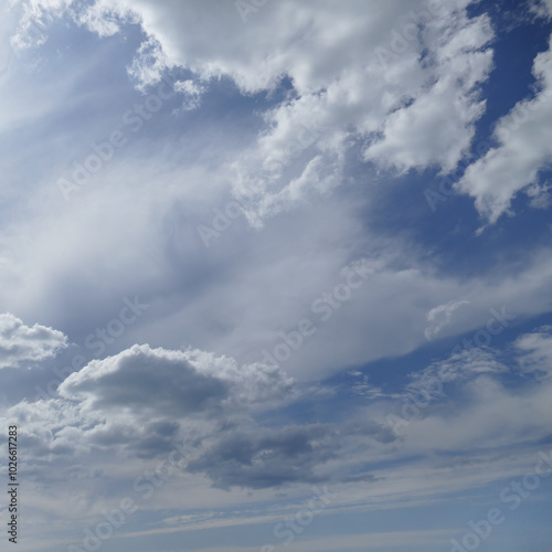 © Serghei V, Obraz premium Sun on beautiful blue sky with white clouds.