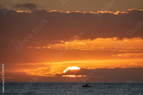 © F.C.G., Obraz premium Sun over the ocean skyline with small fishing boat