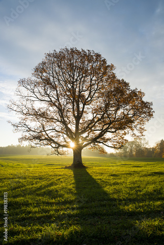 © Sebastian, Obraz premium Sun popping through the almost empty branches of a beech tree on autumn morning in october