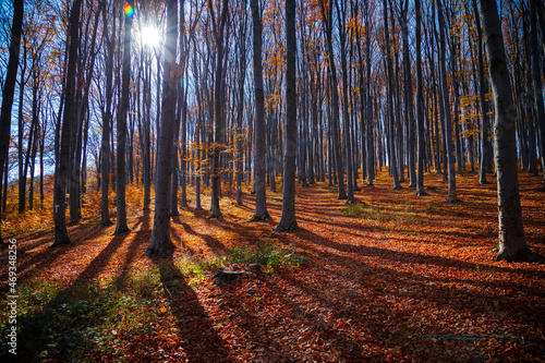 Obraz premium Sun rays among tree silhouettes in a fall day
