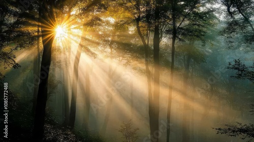 Naklejka premium Sun rays breaking through the canopy of a misty forest at sunrise.
