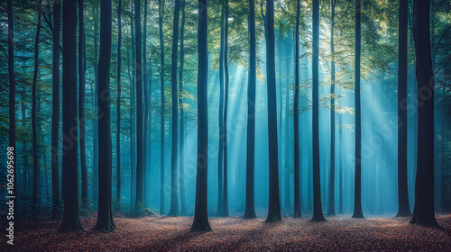 © bcendet, Naklejka premium Sun rays breaking through the misty forest.