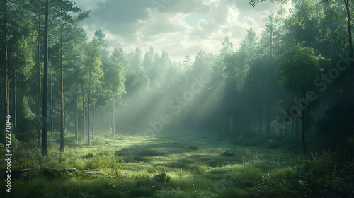 Fototapeta premium Sun rays filtering through tall trees in a serene green forest with a grassy...