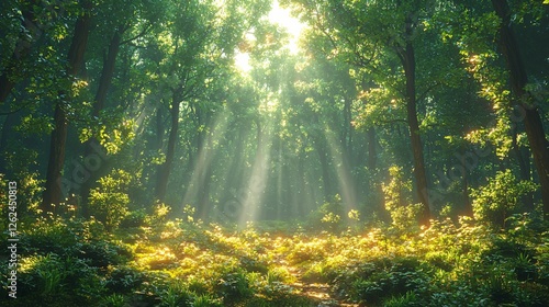 © Suparerk, Obraz premium Sun Rays Forest, Magical Green Woods