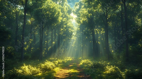 © Santi, Obraz premium Sun rays illuminate a path through a dense forest.