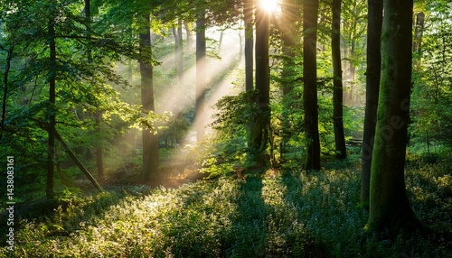 © Abele, Obraz premium sun rays illuminating dense greenery in a tranquil forest