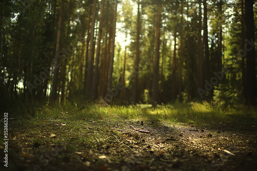 Obraz premium sun rays in coniferous forest, abstract landscape summer forest, beautiful...