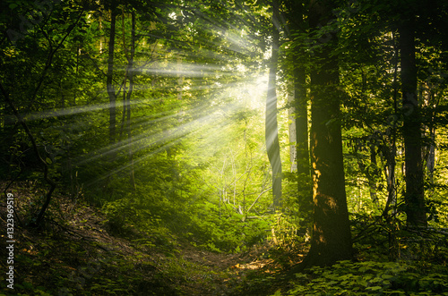© andreiuc88, Fototapeta premium sun rays in green magical woods