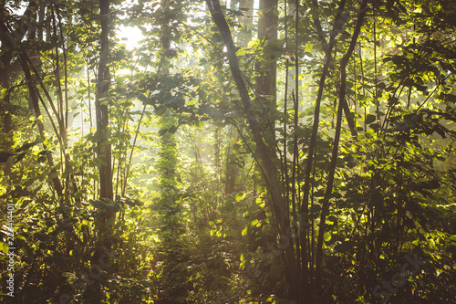 Fototapeta premium Sun rays in the forest after rain, high humidity