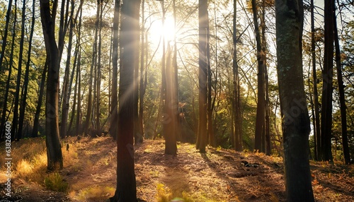 © Hafiza, Obraz premium sun rays in the forest ai generative