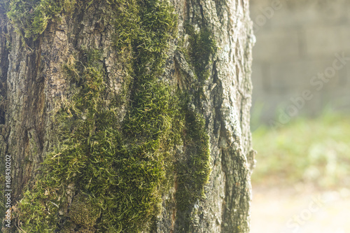 Obraz premium Sun rays on tree bark with moss
