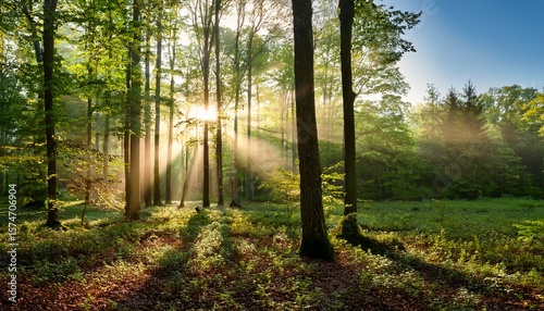 Obraz premium sun rays pass through morning in the deciduous woods