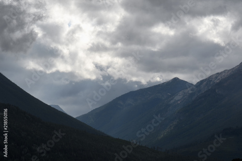 Fototapeta premium Sun rays peak through dramatic clouds over St Mary Lake in Kimberley, Canada