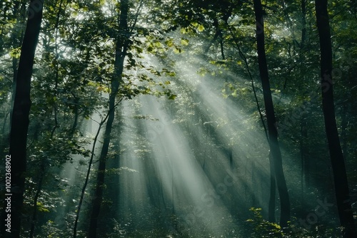 © Luxetify, Fototapeta premium Sun rays penetrate through the trees in a dense forest.