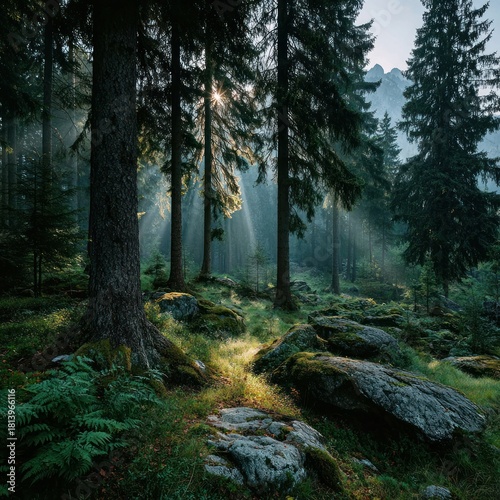 Fototapeta premium Sun rays pierce a dense forest, illuminating trees, mossy rocks, and lush...