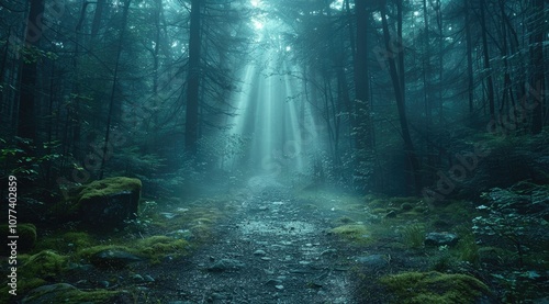 Fototapeta premium Sun rays pierce through misty forest, illuminating path ahead.