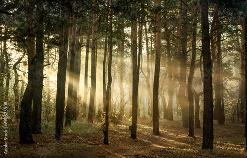 © Mykhailo, Obraz premium Sun rays play in the branches of trees. Autumn forest. Autumn colors. Morning. Walk in the woods.