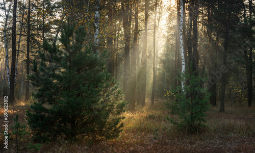 © Mykhailo, Fototapeta premium Sun rays play in the branches of trees. Autumn forest. Autumn colors. Morning. Walk in the woods.