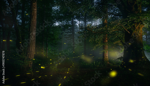© Ilal, Obraz premium Sun rays shine through rainy forest trees creating a calm green woodland scene