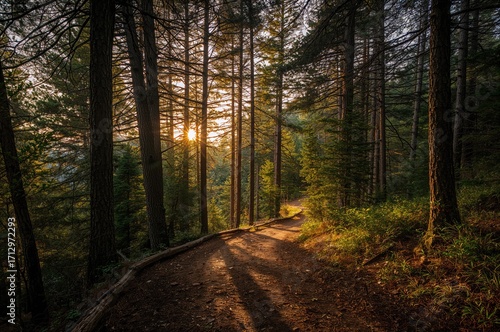 Fototapeta premium Sun rays shine through tall pine trees, illuminating the trail