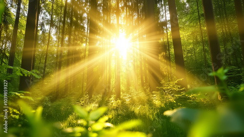 Fototapeta premium Sun rays shine through trees in a tranquil forest, lighting up the vibrant...