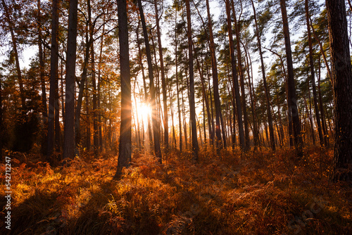 Obraz premium Sun rays shining between trees in pine forest with fern in autumn