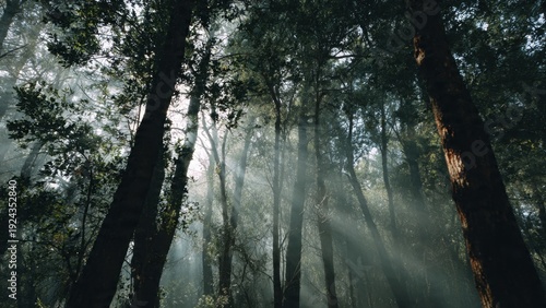 Obraz premium Sun rays shining through a dark forest