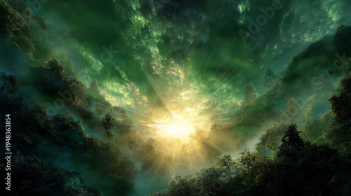 Fototapeta premium sun rays shining through a lush green forest clouds