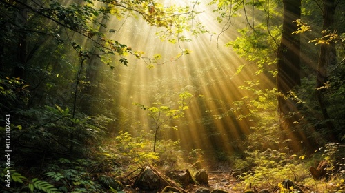 Obraz premium Sun Rays Shining Through Forest Canopy