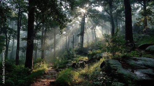 Fototapeta premium Sun rays shining through green forest after morning rain