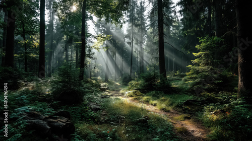 Obraz premium Sun rays shining through tall summer forest trees, soft mist and deep greens, calm and immersive nature