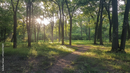 © Bilal, Obraz premium Sun rays shining through the trees in a forest setting