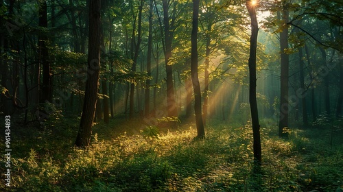 Naklejka premium Sun rays shining through the trees in a misty forest.