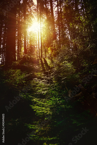 Obraz premium Sun rays shining through the trees in the forest