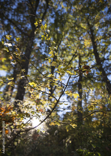 © bellakadife, Fototapeta premium Sun rays shining through trees ,nature background