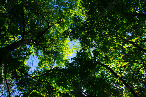 © arenaharyan, Obraz premium Sun rays shining through trees ,nature background