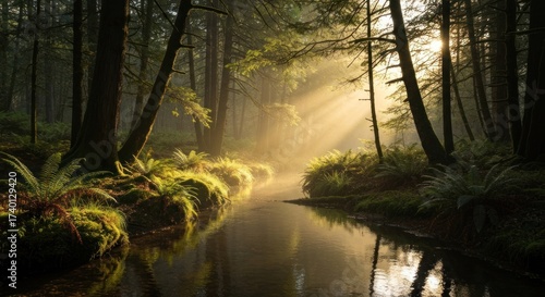 © Lemdah, Fototapeta premium Sun rays stream through lush green forest, reflecting in a calm stream