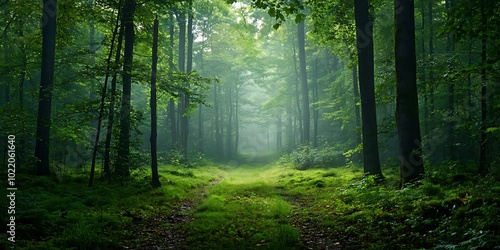 Obraz premium Sun Rays through Misty Forest Path