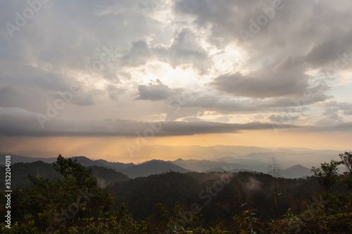 © upslim, Obraz premium Sun rays through the cloudy sky and mountains. Wallpaper and background concept