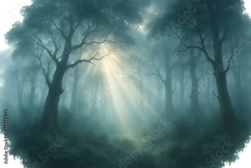 © Zahid, Fototapeta premium Sun rays through the forest in the morning with fog and mist around trees