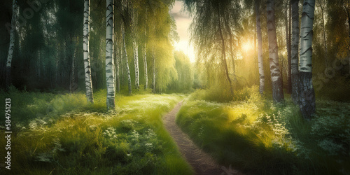Fototapeta premium sun rays through the healthy morning birch forest, green environment...