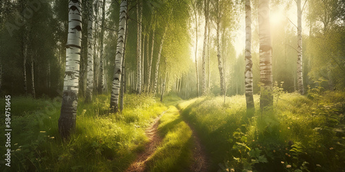 Obraz premium sun rays through the healthy morning birch forest, green environment...