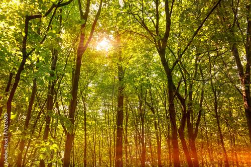 © Maxal Tamor, Fototapeta premium Sun rays through the tree in a deep forest
