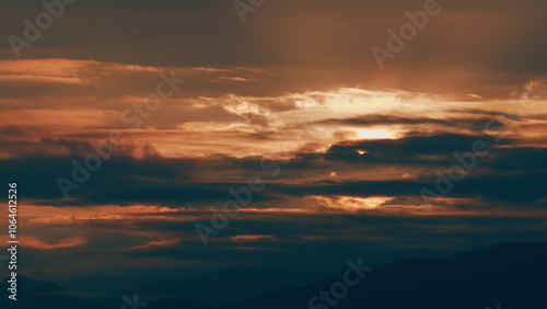 Obraz premium Sun Rises Over A Mountain Range Under Dramatic And Swirling Clouds. Dramatic Sky.
