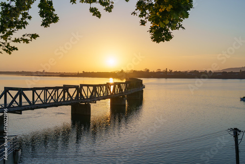 Fototapeta premium Sun rises over Tauranga harbour and historic railway bridge on calm morning