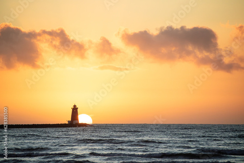 Fototapeta premium Sun rising behind a lighthouse, beautiful sunrise