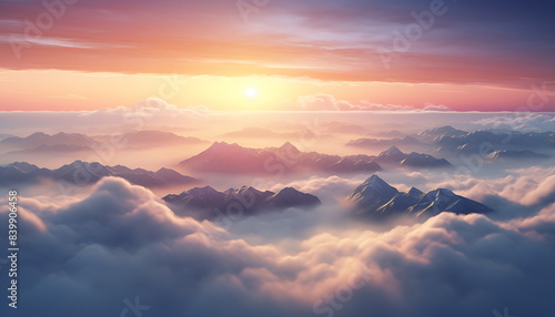 Obraz premium sun rising over clouds and mountains, generative ai
